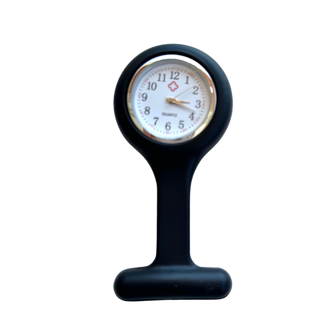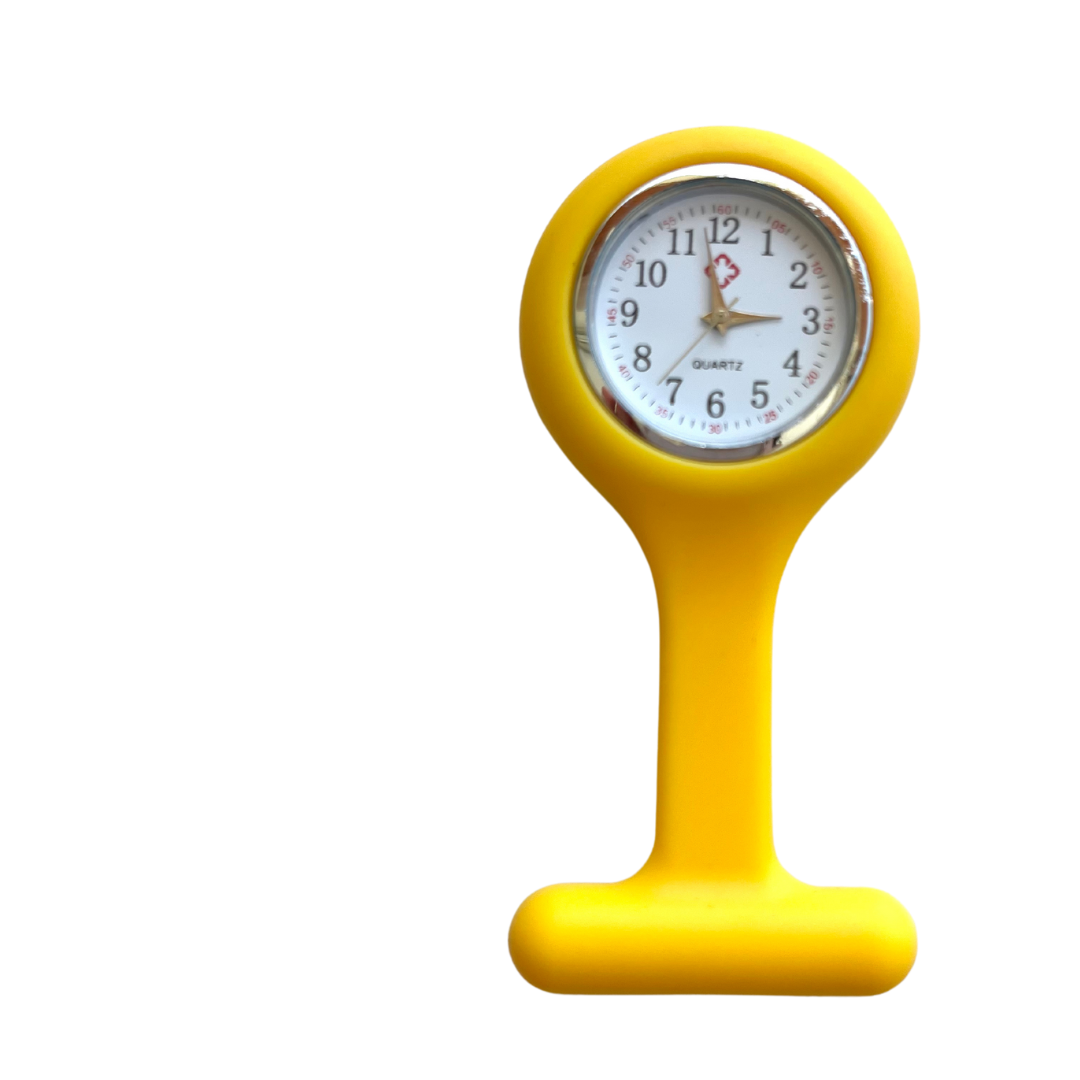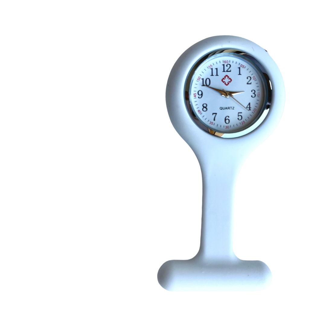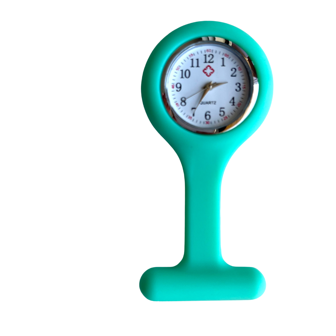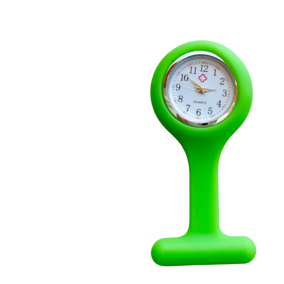 Este práctico reloj de manecillas está montado en un soporte de silicona que se adhiere al uniforme 👚 con un pin 🧷. Su posición permite visualizarlo desde varios ángulos 🧿👁️, incluso cuando se está inclinado sobre el paciente, lo que facilita la realización de los controles vitales sin necesidad de utilizar las manos 🖐️🤚🏼. De esta manera, se evita el contacto con elementos del entorno que puedan contener gérmenes 🧫🦠.