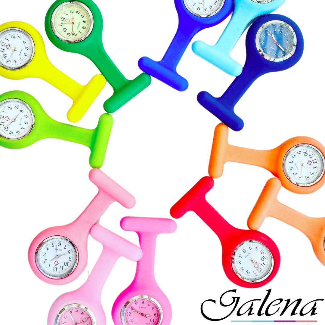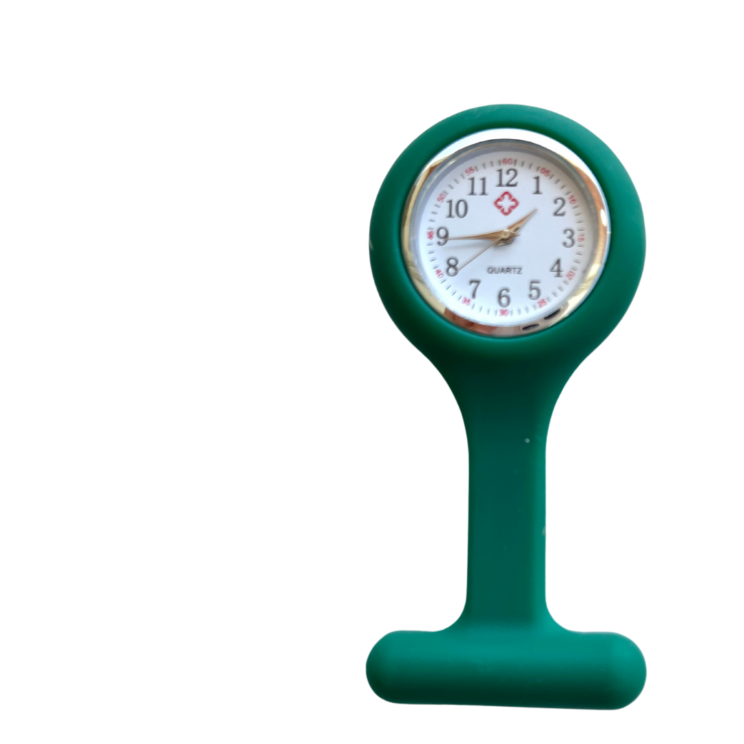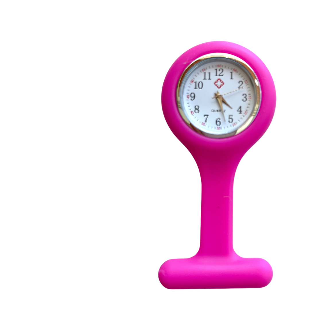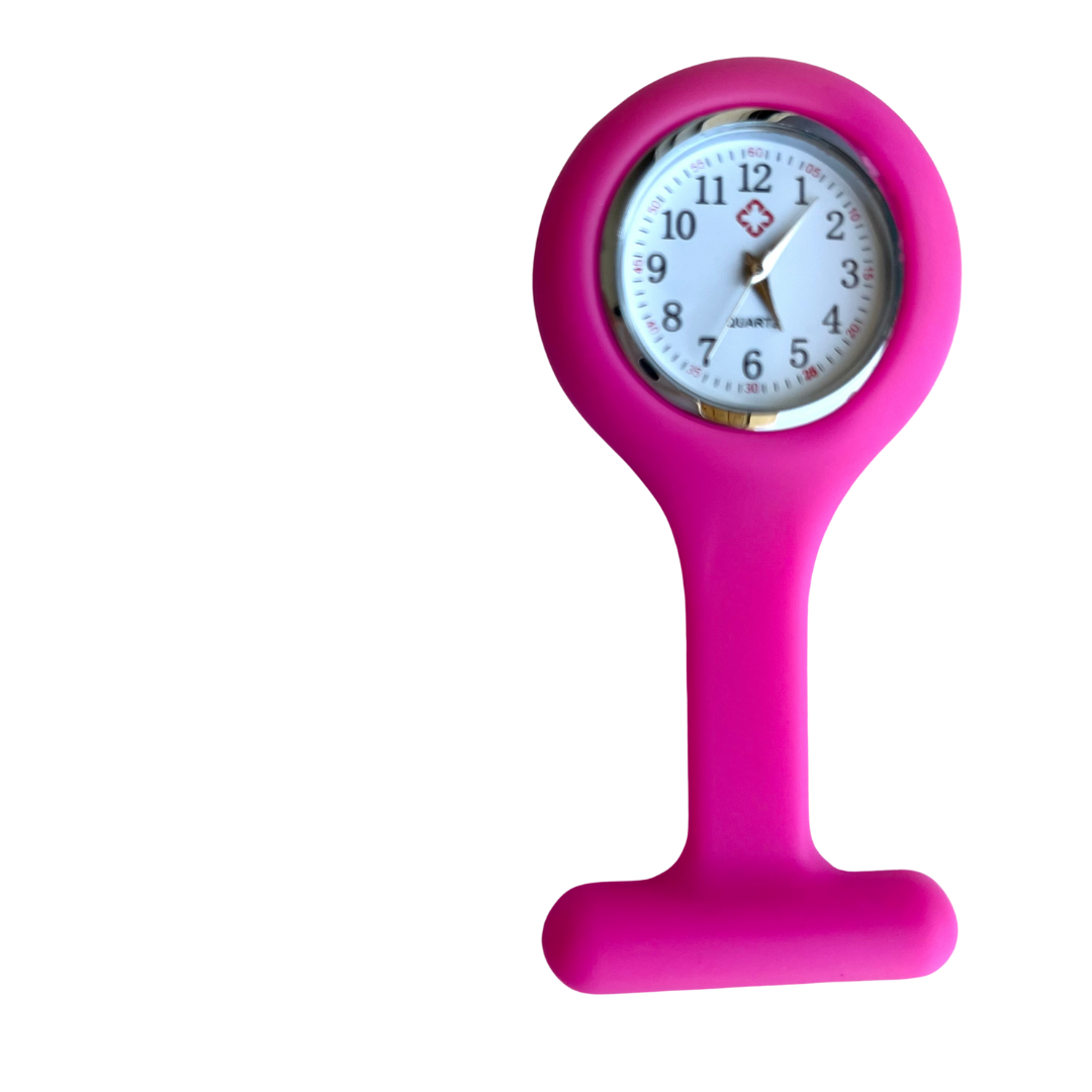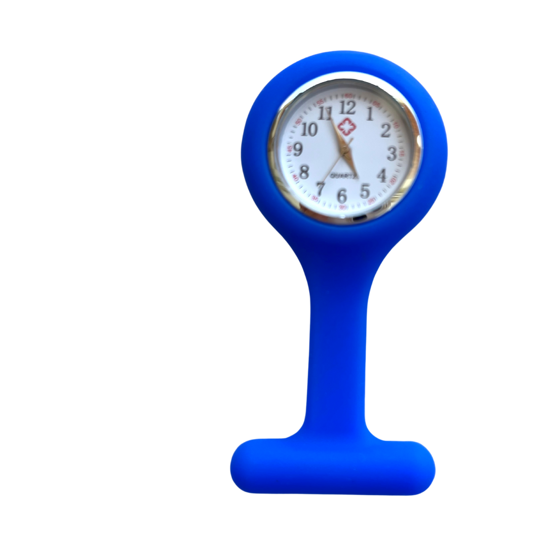 Este práctico reloj de manecillas está montado en un soporte de silicona que se adhiere al uniforme 👚 con un pin 🧷. Su posición permite visualizarlo desde varios ángulos 🧿👁️, incluso cuando se está inclinado sobre el paciente, lo que facilita la realización de los controles vitales sin necesidad de utilizar las manos 🖐️🤚🏼. De esta manera, se evita el contacto con elementos del entorno que puedan contener gérmenes 🧫🦠.